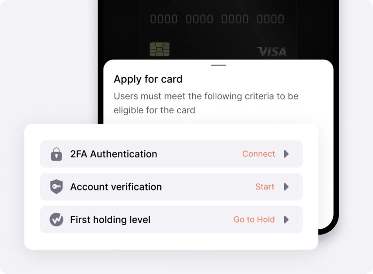 Before applying for the Exchange card registration, make sure you have activated 2FA in your exchange account, verified your identity, and have the first Holding level.